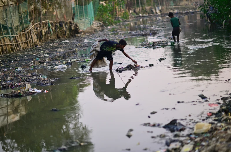 在一排臭气熏天的厕所旁的排水沟里,13岁的拉哈莫特・乌拉正蹚着齐腰深的污水,在浑浊的粪水中捡拾废弃塑料。在污水里泡上五个小时,他捡到的塑料勉强能塔卡(约.8人民币)。十天前,他在污水里跋涉时,被一根竹子戳伤了眼睛,至今眼白仍布满血丝。他害怕自己会失足淹死在水沟里,更害怕自己想当老师的梦想,永远都无法实现。